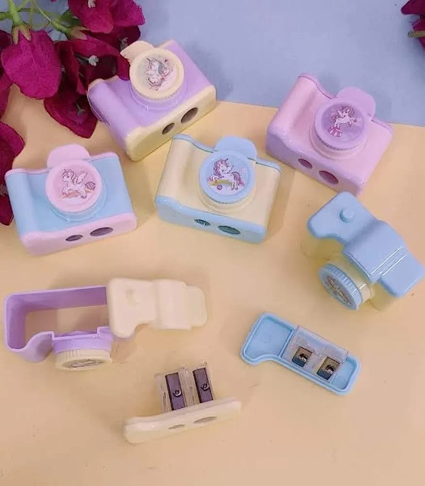 Camera Shape Sharpener comes in Purple Pink, Purple Yellow, Yellow Blue, Pink Blue.