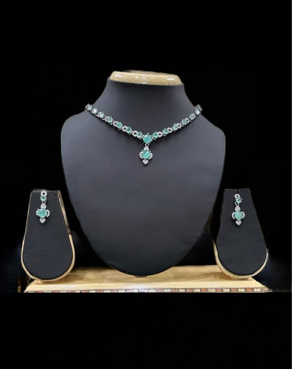 Lovely Rhodium Diamond Chain Necklace with Earring Set gives you dashing look. at RS Collections Quality Product are available at Affordable Prices. It Last long when you care for this American Diamond Jewelry. Keep it away from Perfumes, Water and keep it away when you sleep.